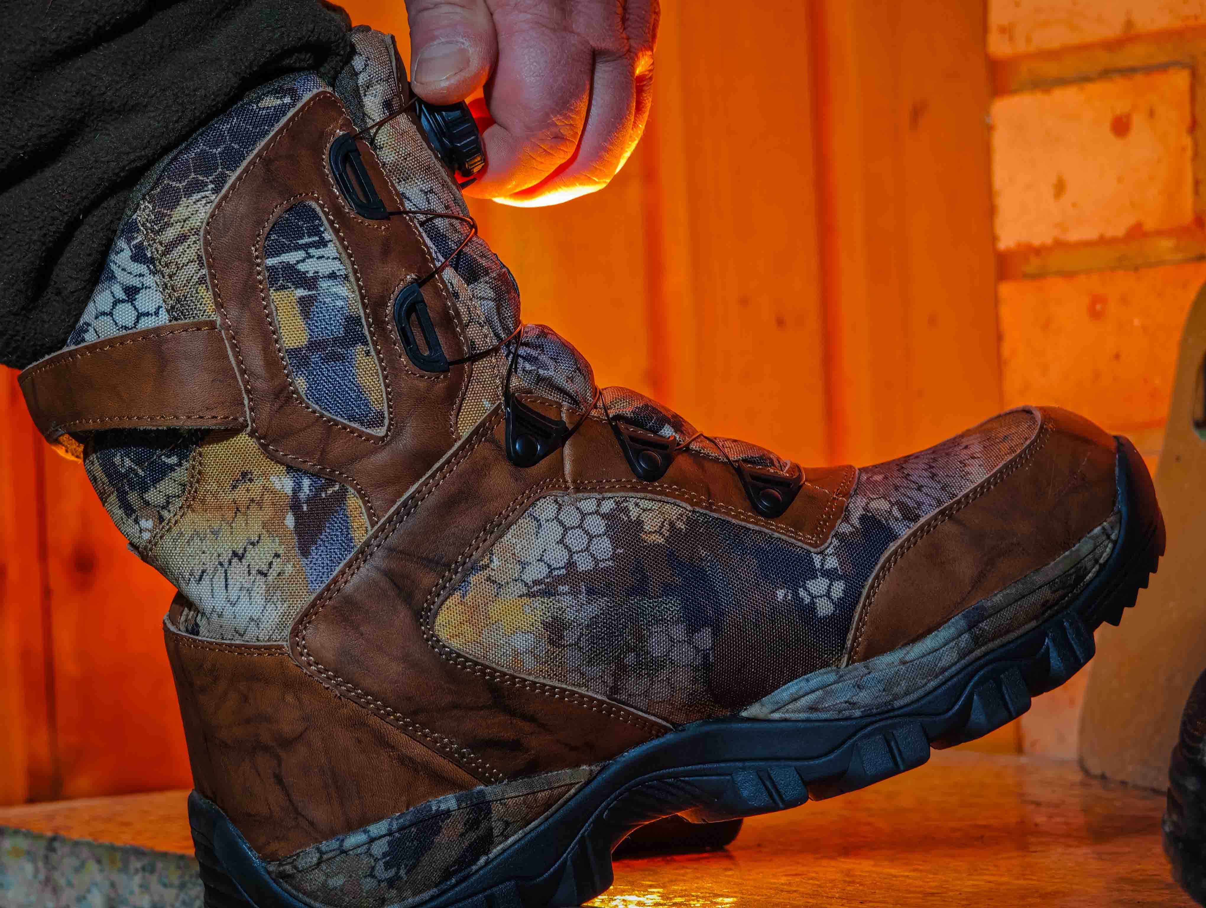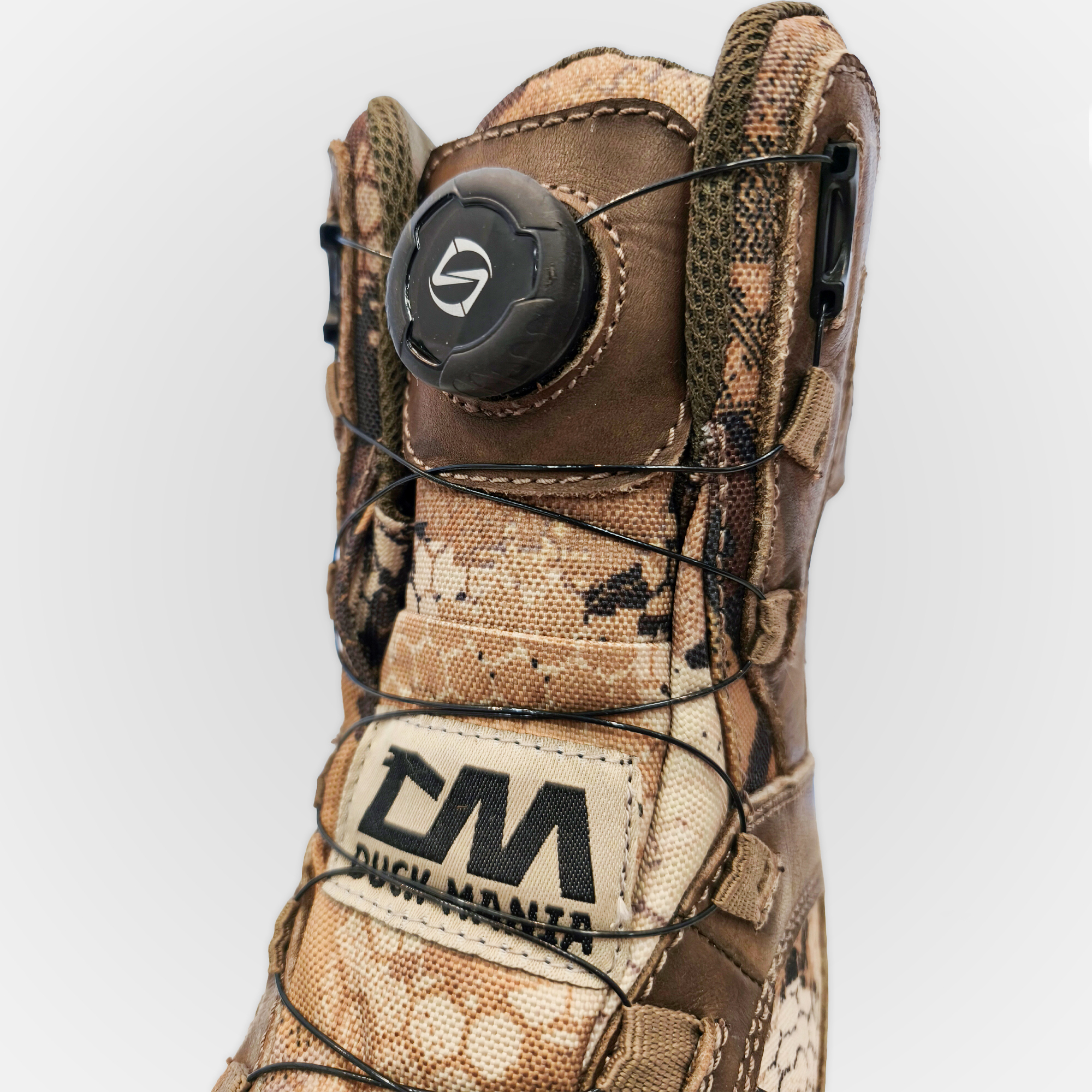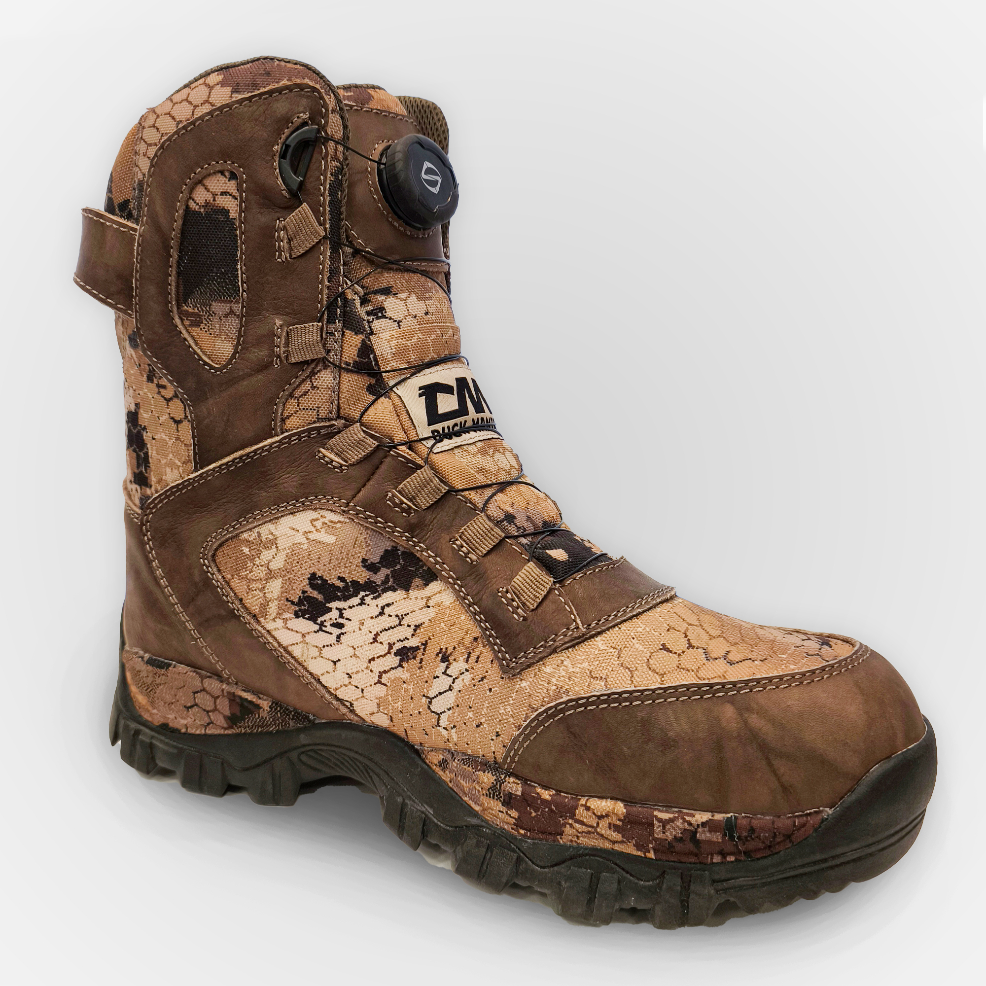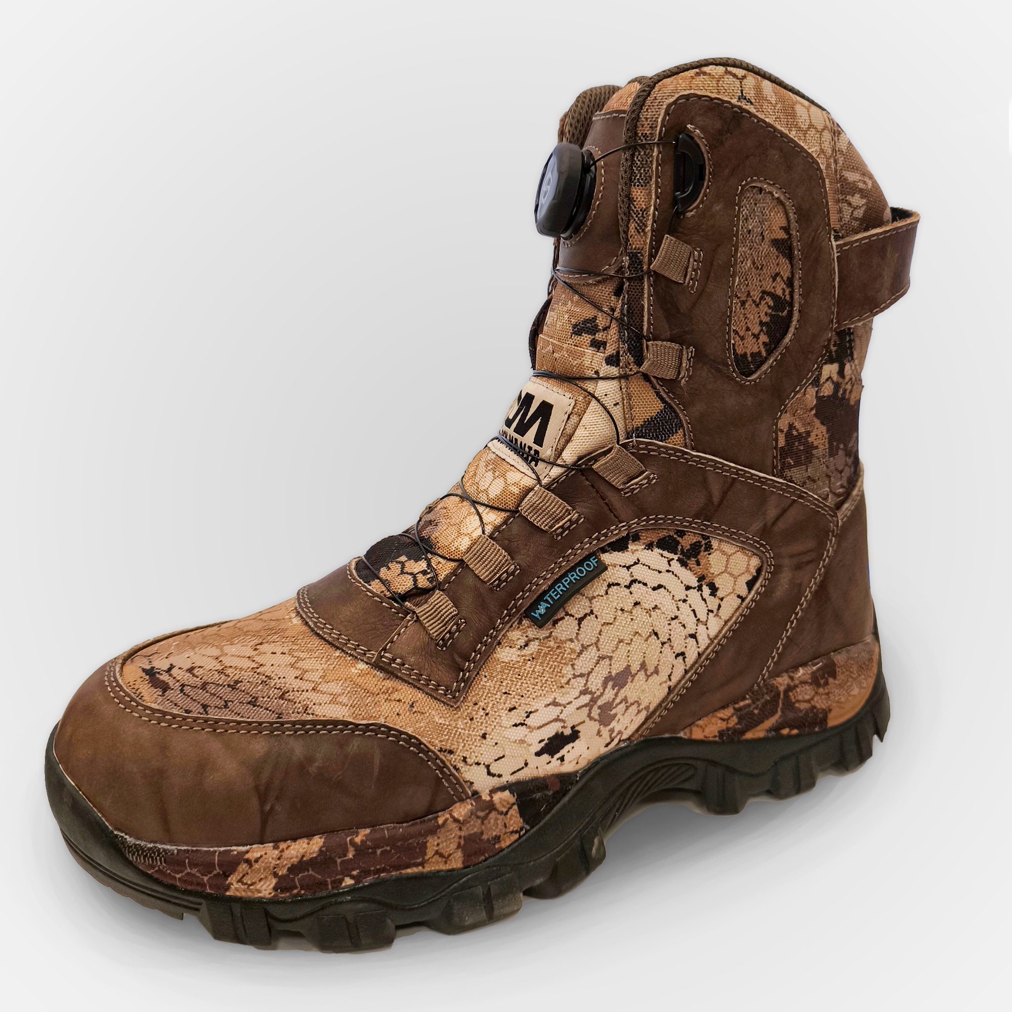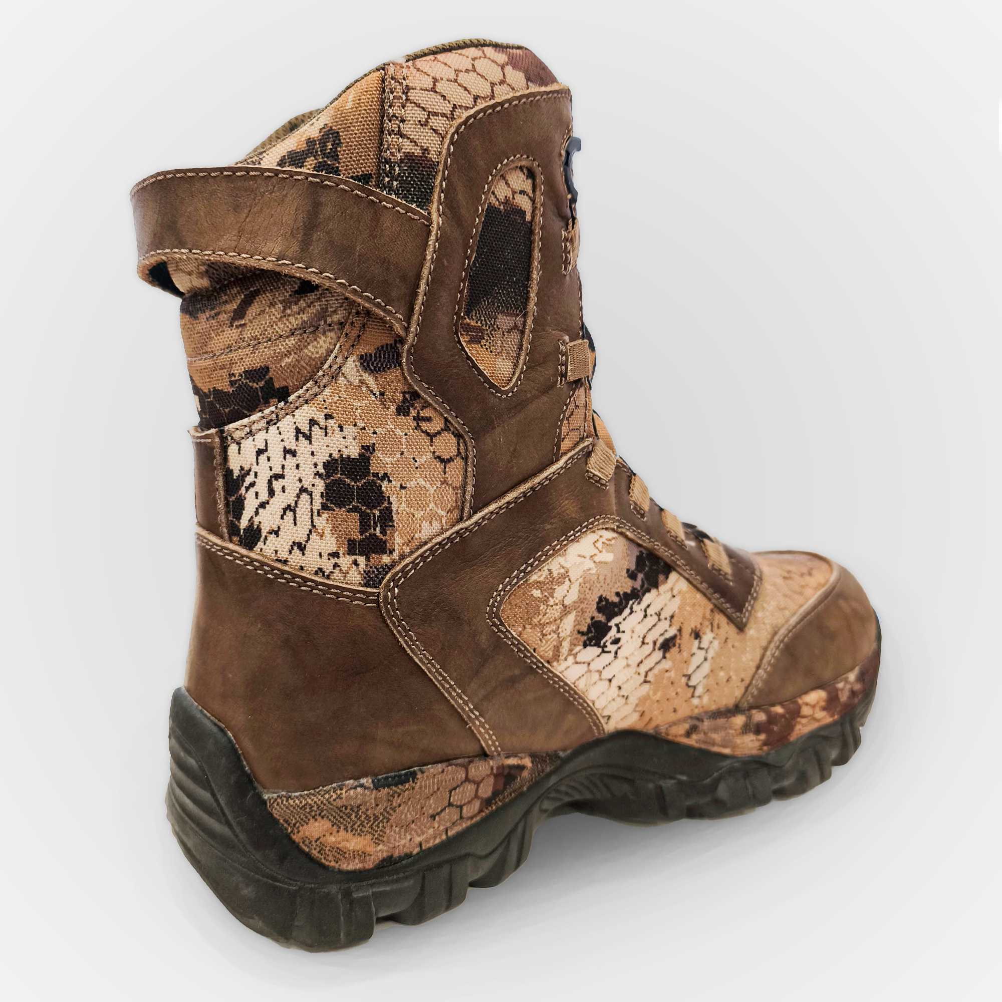 Трекинговые ботинки с высоким берцем и анатомической подошвой разработаны для продолжительной ходьбы весной и поздней осенью по пересеченной местности. Вместо привычных шнурков, имеют ультра прочные тросики которые затягиваются за счет вращения диска. расшнуровать так же легко, надо просто потянуть диск вперед. Отлично подойдут не только для охоты, но и для повседневной носки или туристических походов. Специальная стелька впитывает влагу от ноги и нейтрализует неприятные запахи. В производстве обуви используется водонепроницаемая мембрана, которая выпускает испарение изнутри, но при этом не пропускает влагу снаружи. Ботинки хорошо защищены от попадания влаги внутрь. Ботинки усилены премиальной кожей, с камуфлированной текстурой.