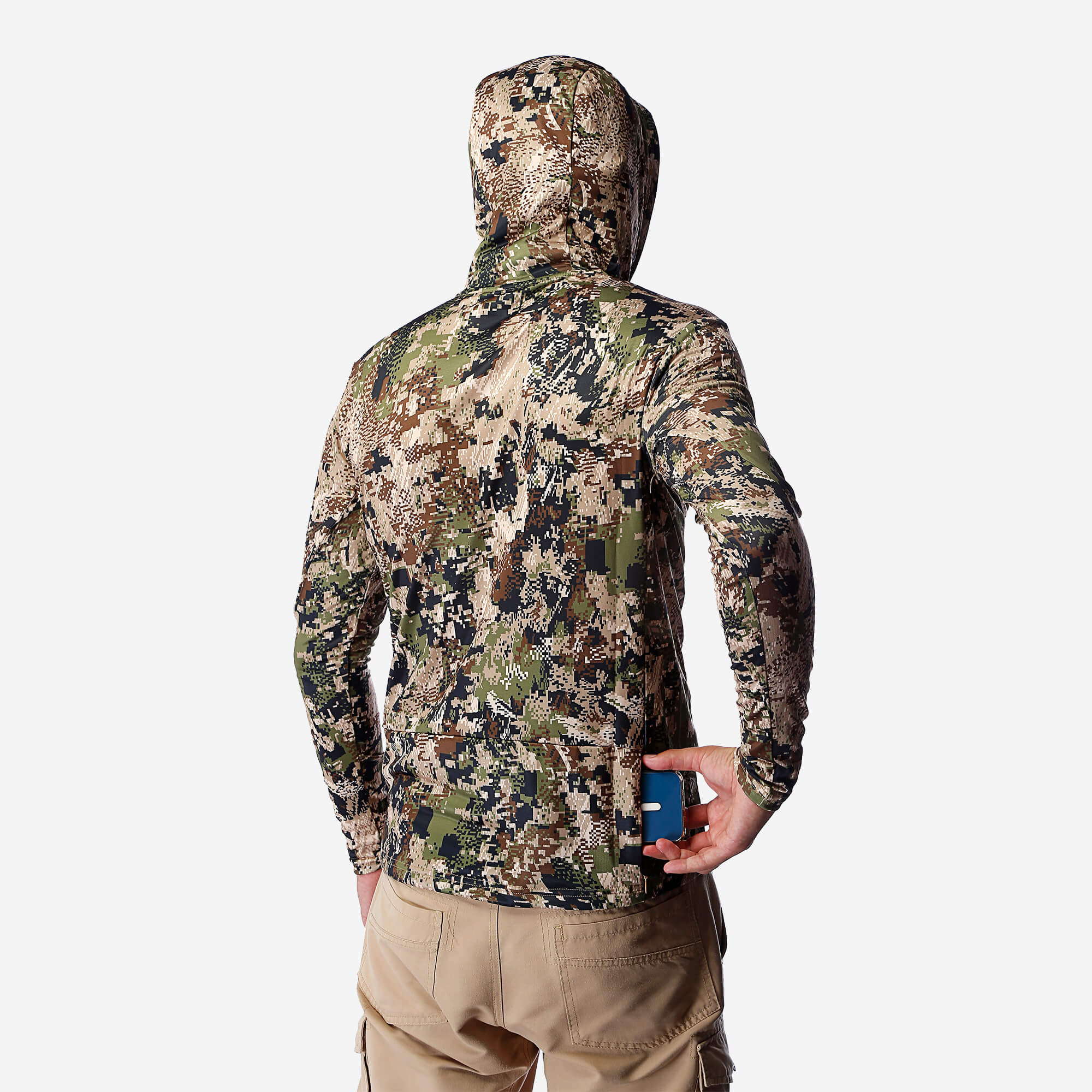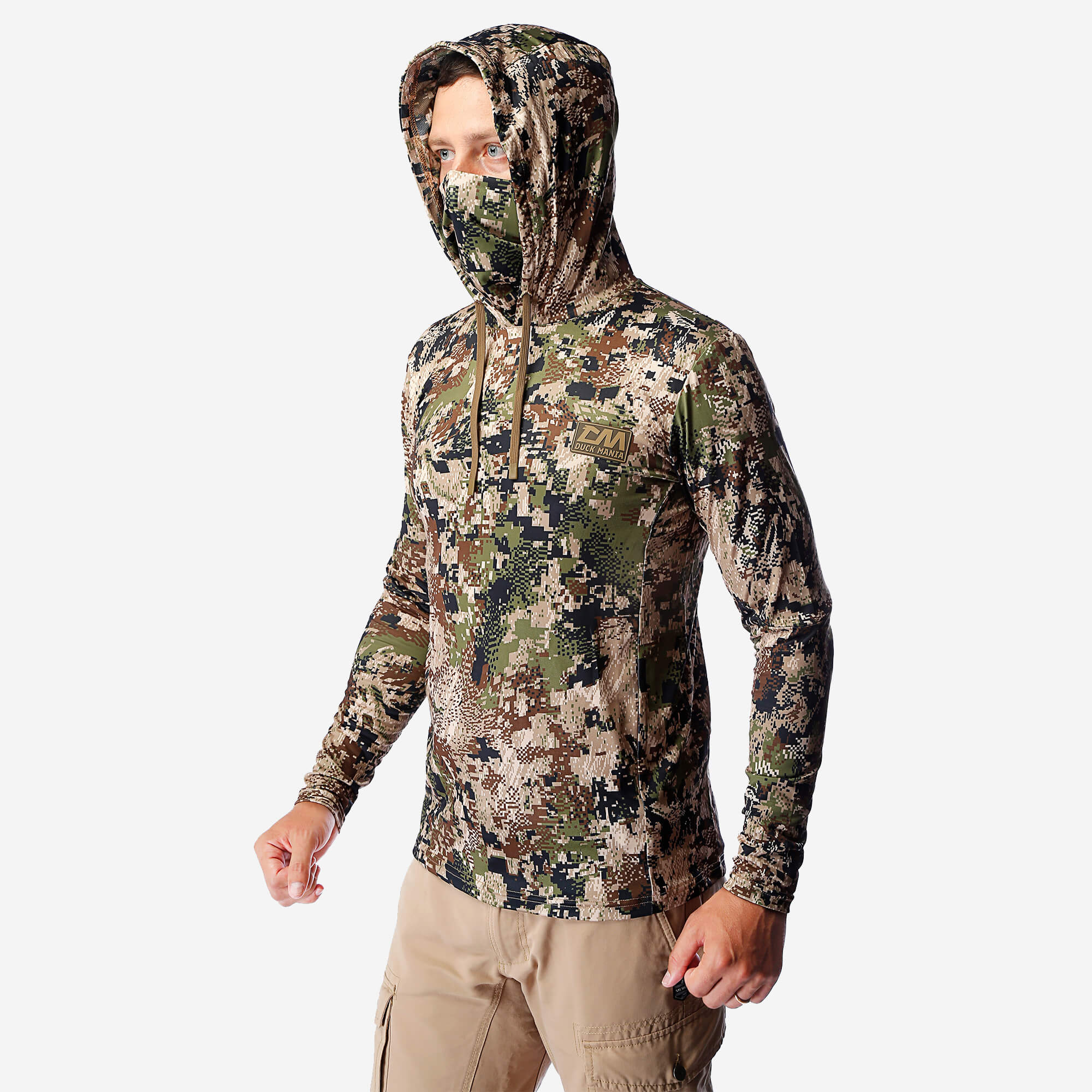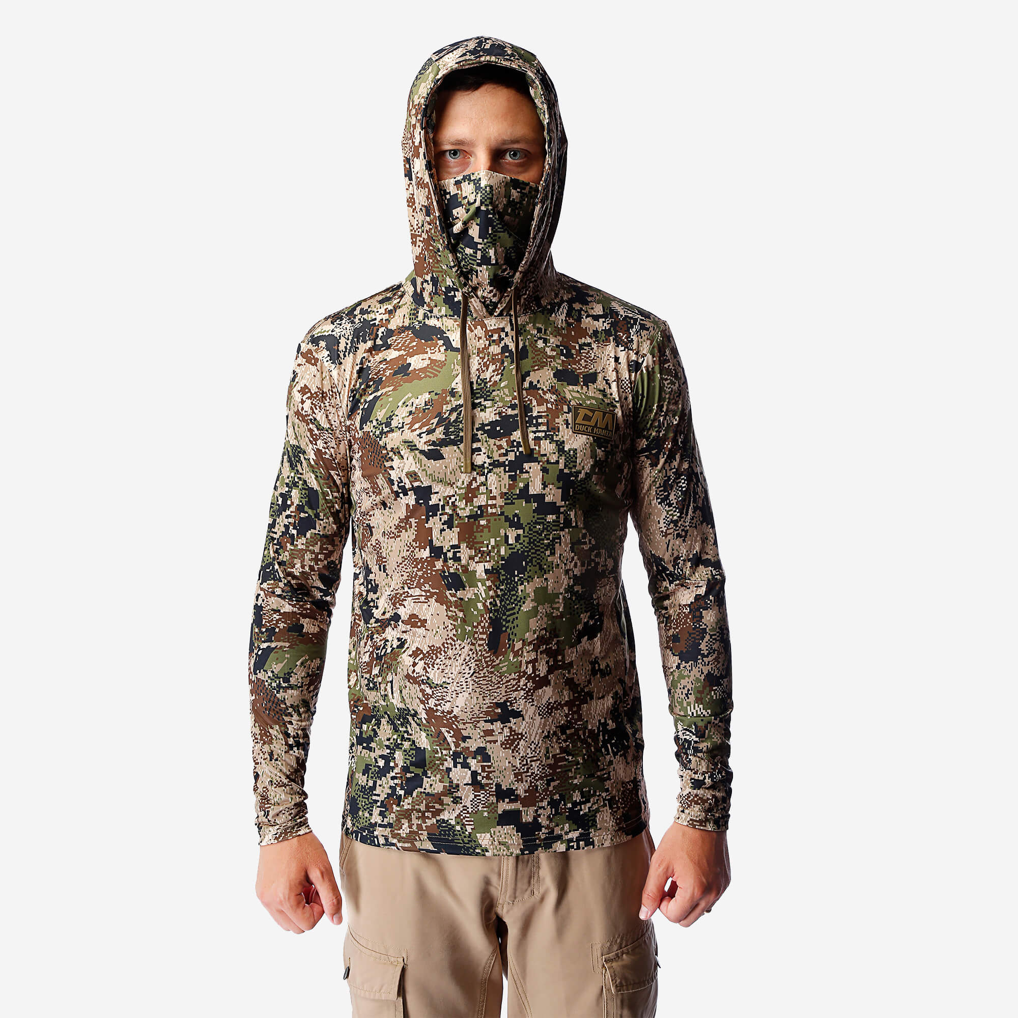 Капюшон и воротник‑маска усиливают маскировку и дополнительно защищают лицо, шею и голову от солнца, ветра и насекомых. В результате вы получаете комфортный, лёгкий и по‑настоящему рабочий слой для долгих часов в поле, на воде или в горах.