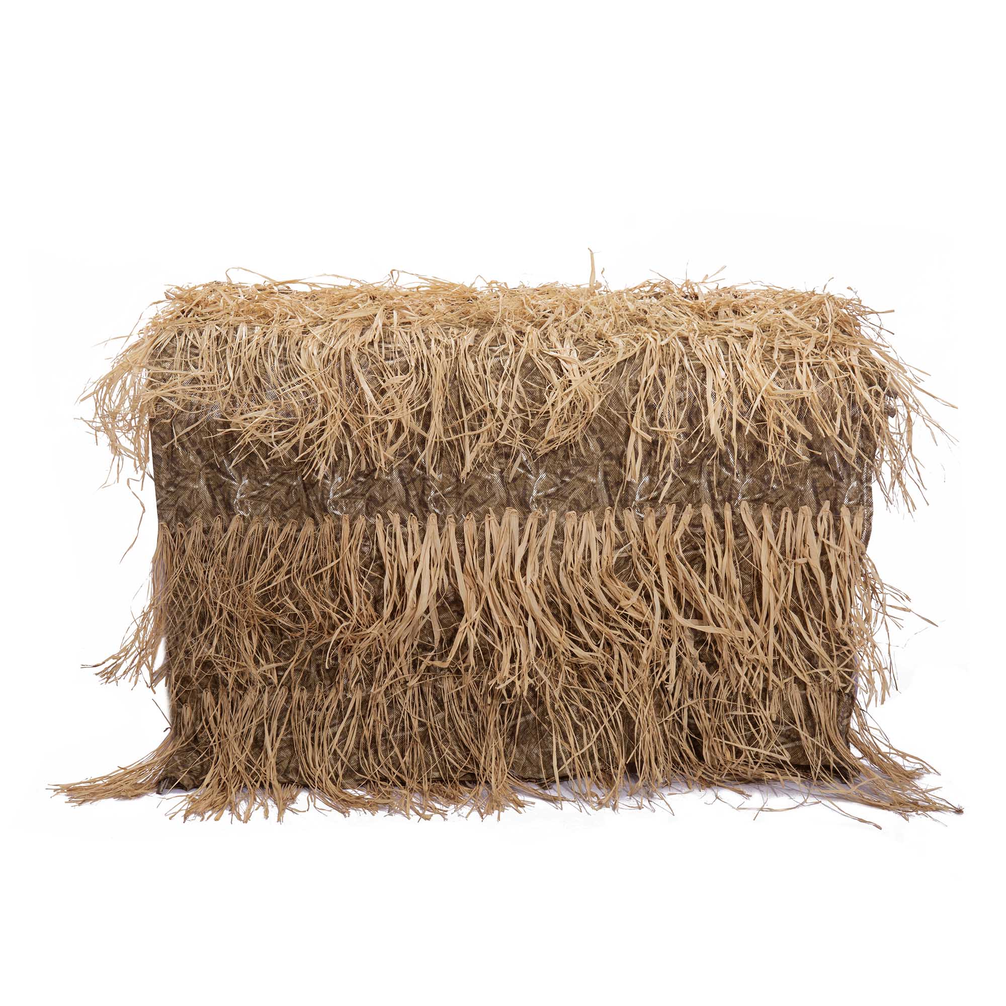 Основой служит прочная полиэфирная ткань, которая не впитывает влагу, не выгорает на солнце и не бликует. На поверхность полотна нашита натуральная рафия — экологичный и долговечный материал, имитирующий траву и камыш.