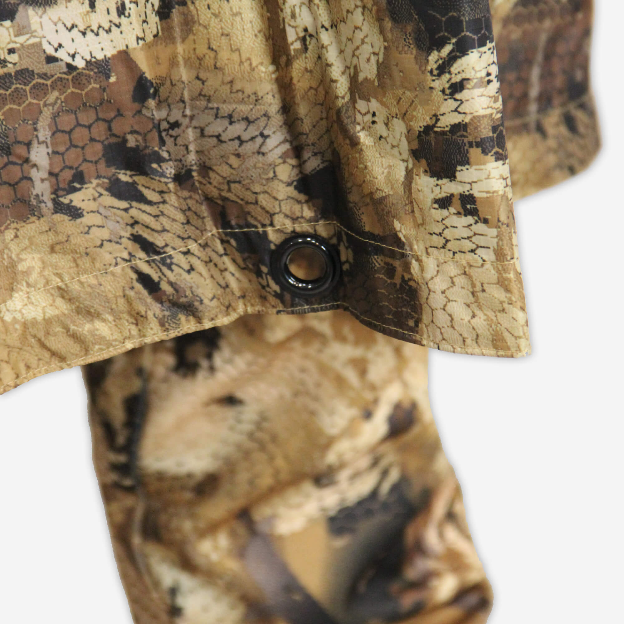 Пончо изготовлено из ткани Ripstop и проклеенных швов с технологией двойной обработки PU. Пончо прочный, с проклеенными швами, легкий и компактный. Ткань Ripstop представляет собой легкую прочную синтетическую ткань, широко используемую в производстве военных дождевиков западными странами, благодаря своим характеристикам. Пончо — это многофункциональный предмет с кнопками по бокам для использования в качестве пончо и люверсами на кромке для использования в качестве укрытия или наземного покрытия.