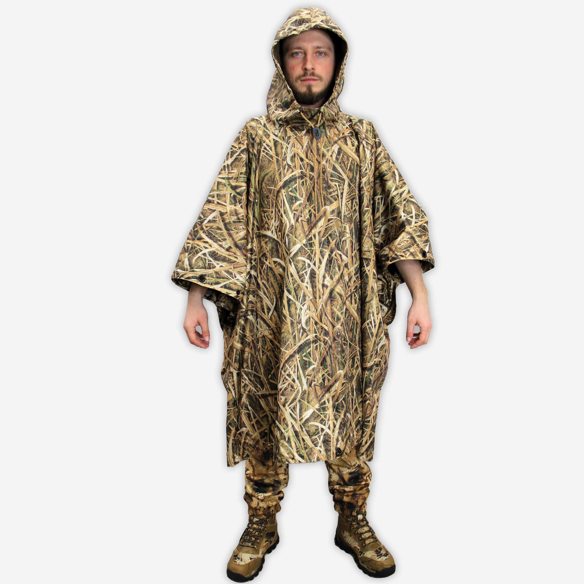 Пончо изготовлено из ткани Ripstop и проклеенных швов с технологией двойной обработки PU. Пончо прочный, с проклеенными швами, легкий и компактный. Ткань Ripstop представляет собой легкую прочную синтетическую ткань, широко используемую в производстве военных дождевиков западными странами, благодаря своим характеристикам. Пончо — это многофункциональный предмет с кнопками по бокам для использования в качестве пончо и люверсами на кромке для использования в качестве укрытия или наземного покрытия.