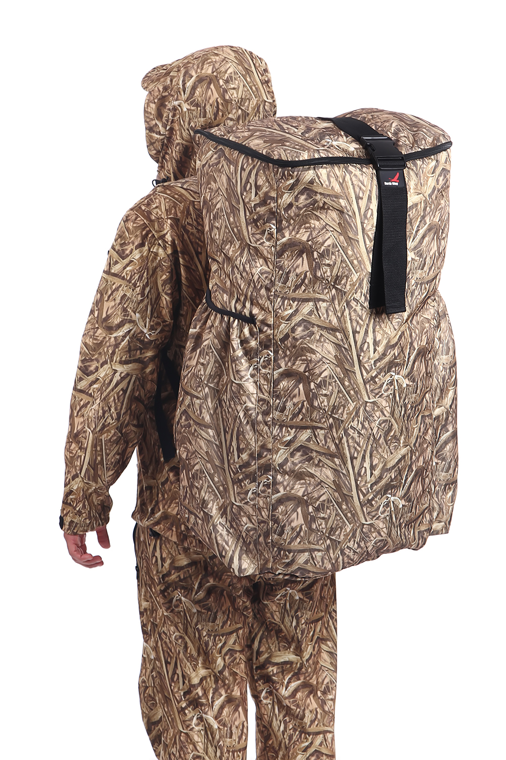 Изготовлен из прочной ткани Oxford 900D с двойной PU‑пропиткой, которая не шуршит, не промокает и устойчива к износу. Материал легко очищается от загрязнений и допускает стирку в стиральной машине, что особенно удобно после влажных охот.