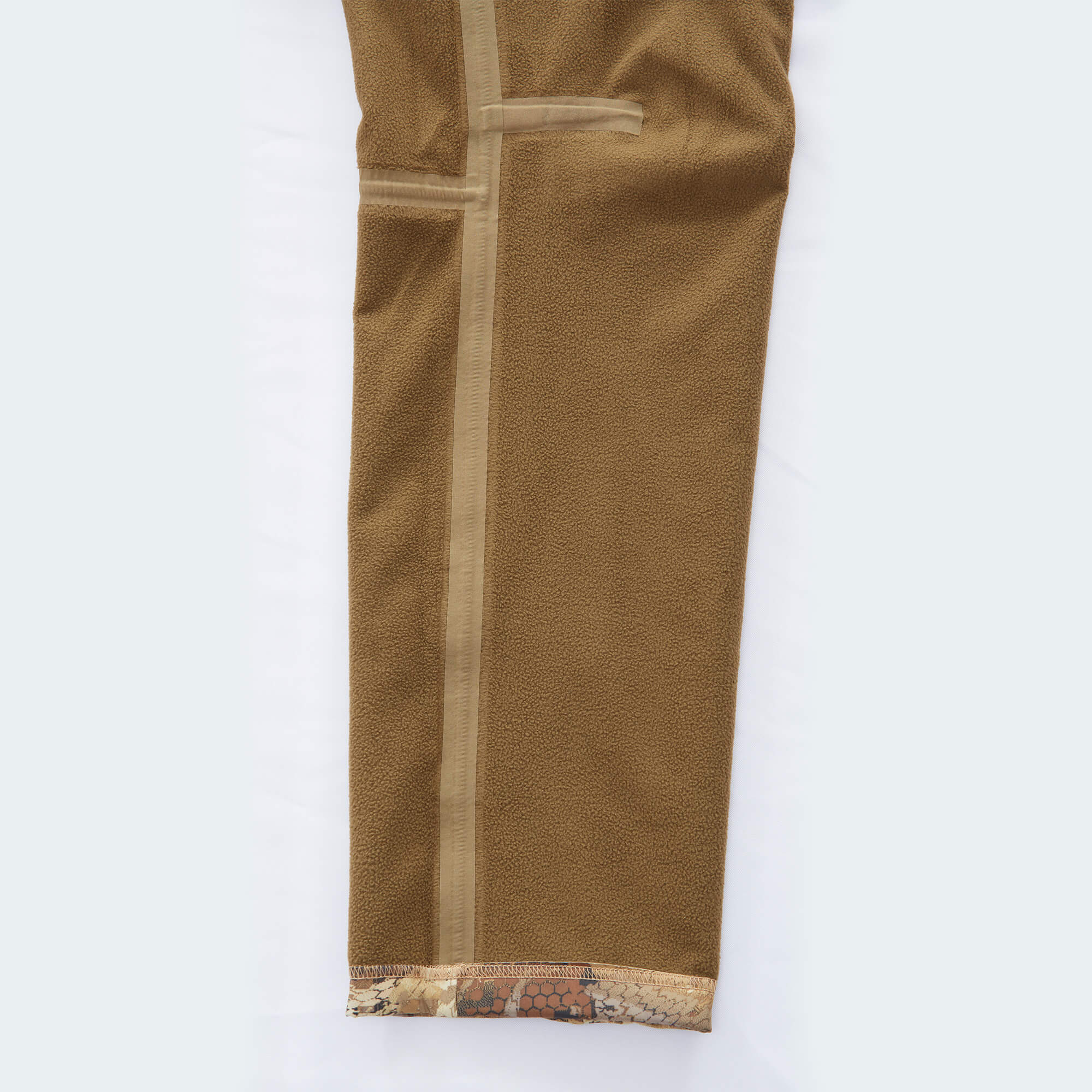От низа штанины до колена выполнены проклеенные швы, которые дополнительно защищают от росы, мокрой травы и влаги на растительности. Утилитарный крой: свободно в бёдрах и заужено к низу, что вместе с эластичной тканью даёт отличную мобильность без «парусности». Все элементы подобраны с учётом маскировки камуфляжа — ничего не блестит и не выделяется.