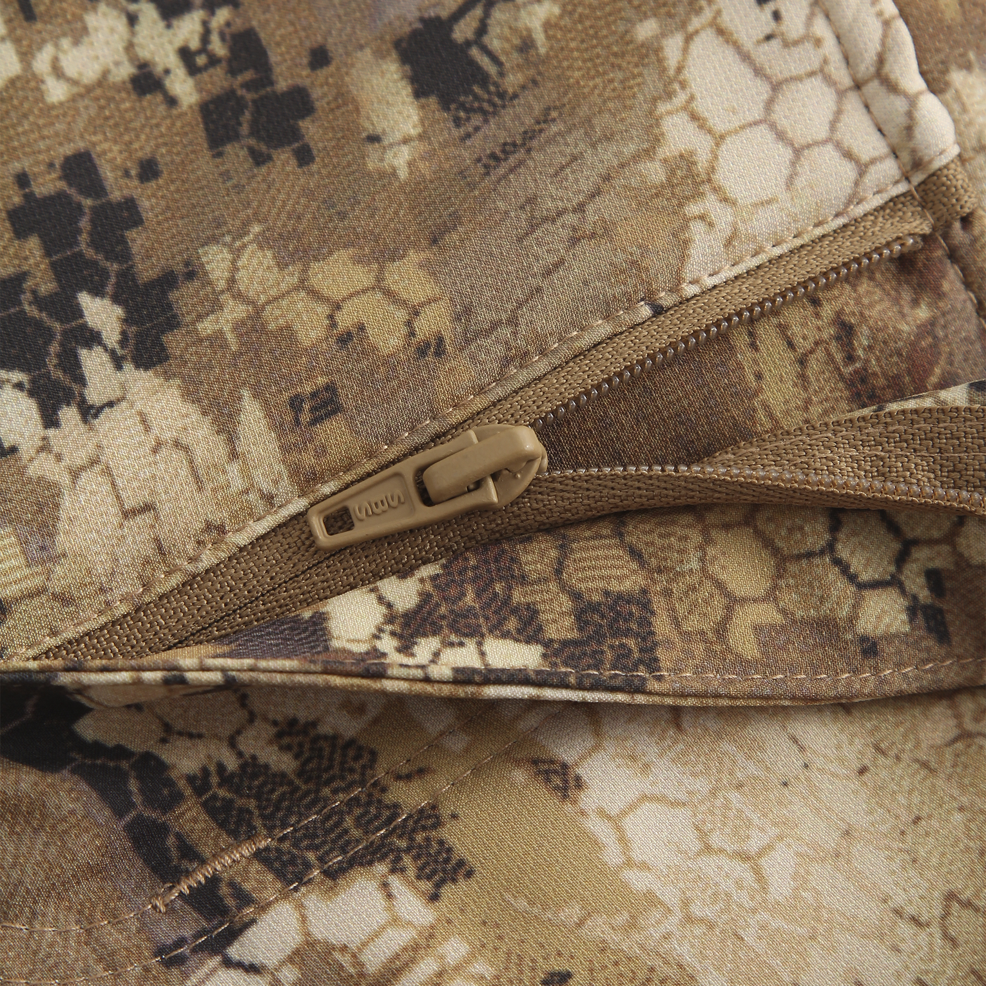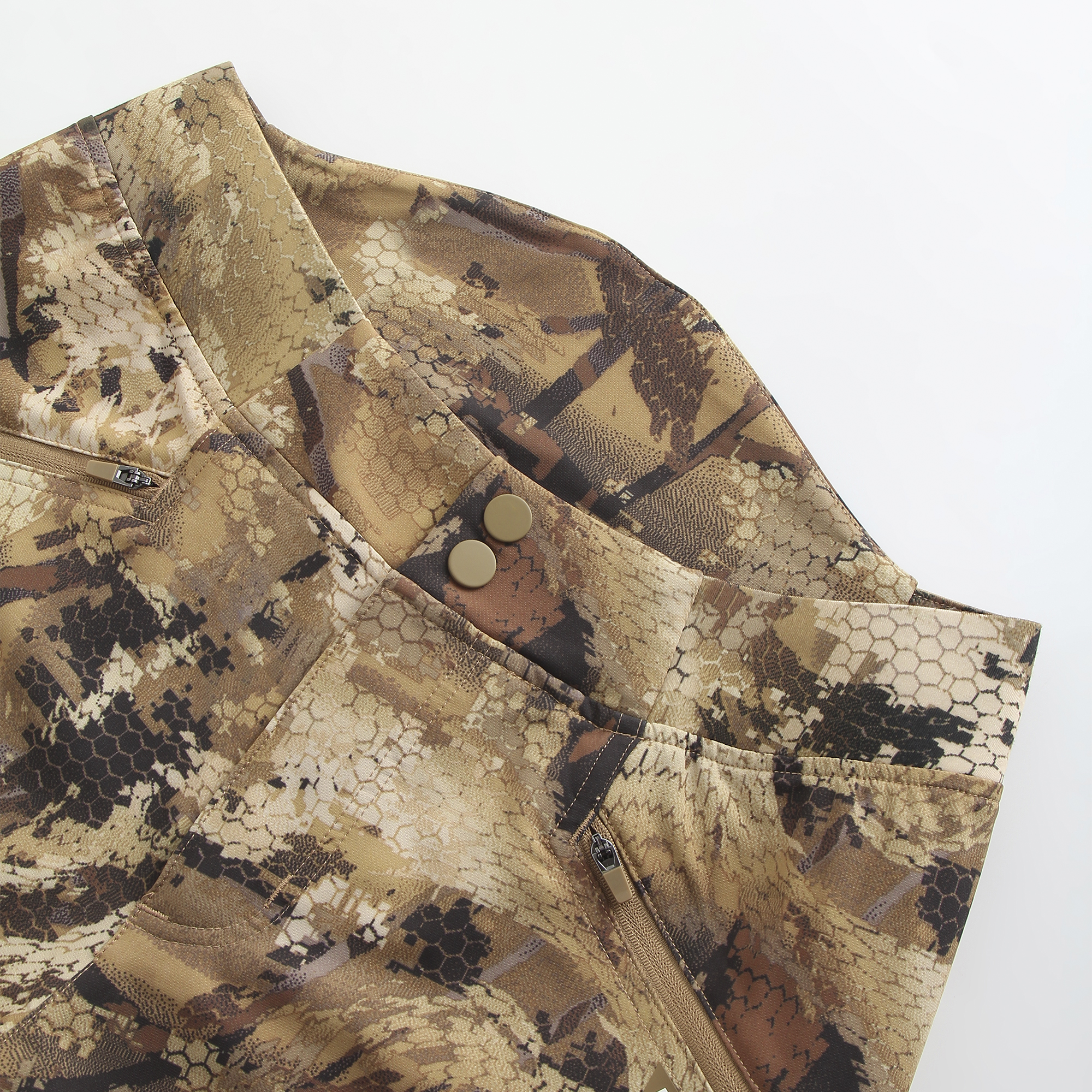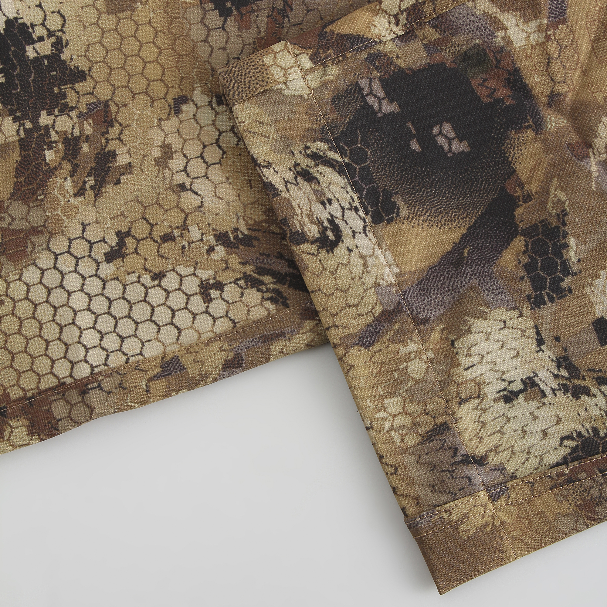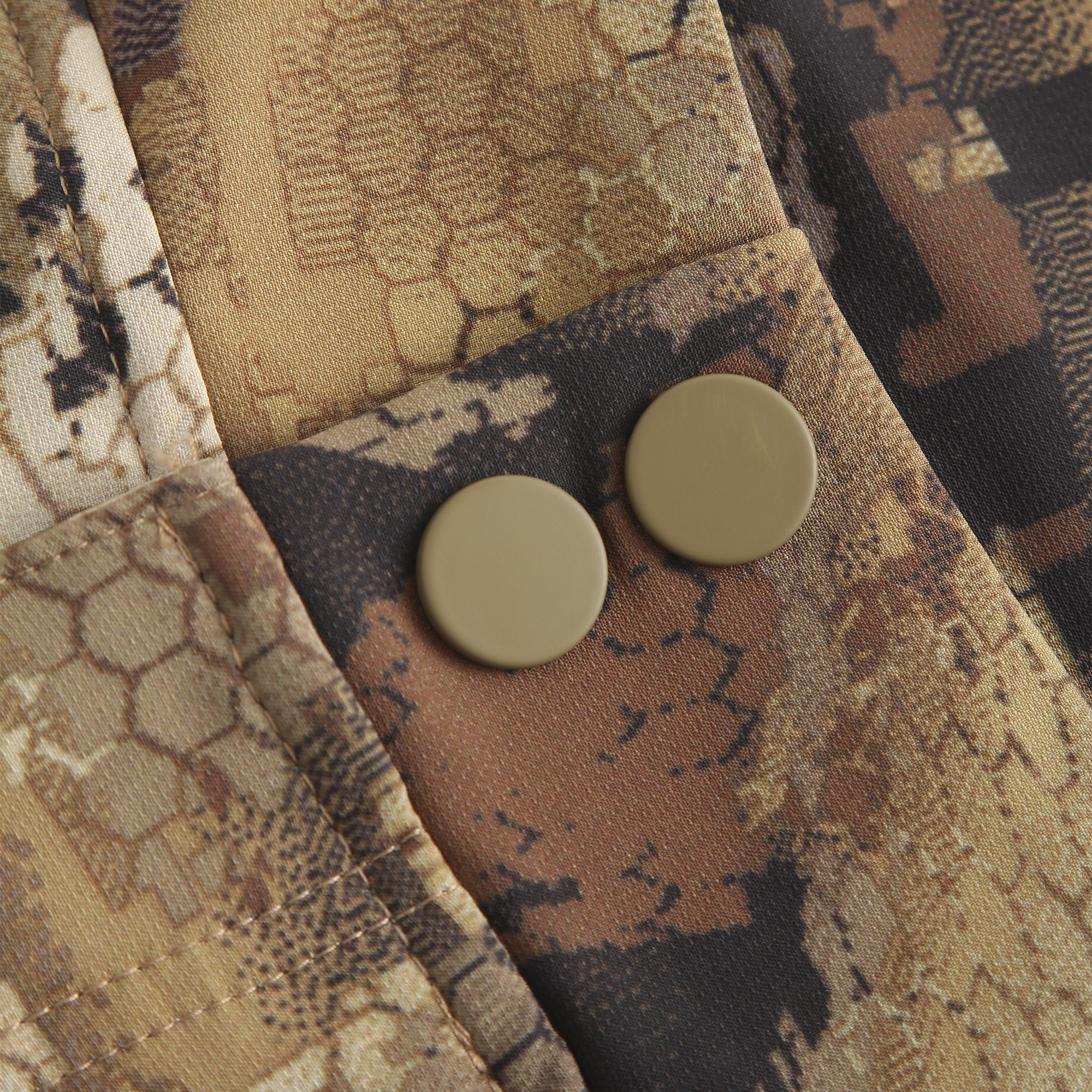 Эластичный «дышащий» материал (полиэстер 94%, эластан 6%) мягко обтягивает ноги, не стесняя шаг и не натирая кожу. Ткань обеспечивает защиту UPF 40+, блокируя до 96% ультрафиолетовых лучей, поэтому ноги надёжно закрыты от солнца в диапазоне температур примерно от +15 до +25 °C. Поверхность устойчива к прокусам комаров, что особенно важно на охоте, рыбалке и в лесных походах.