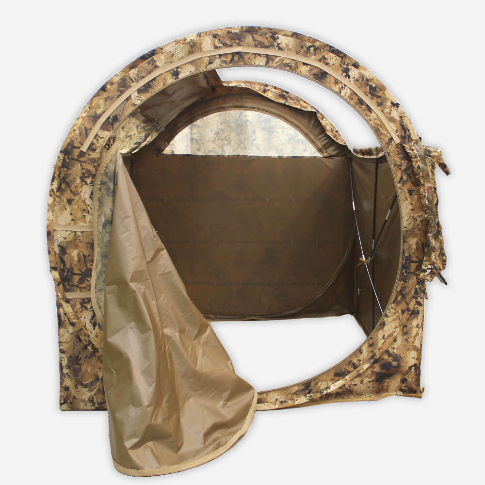 Дубль – одна из самых популярных автоматических засидок для охоты в паре. Конструкция с откидным верхом для прицельной стрельбы. В засидке могут свободно разместиться два охотника в сидячем положении. Имеются карманы и лямки для маскировочного заполнения дополнительным местным камуфляжем. Комплектуется камуфлированным чехлом с лямками для переноски. В комплект входят растяжки и колышки для стабилизации засидки на ветру.