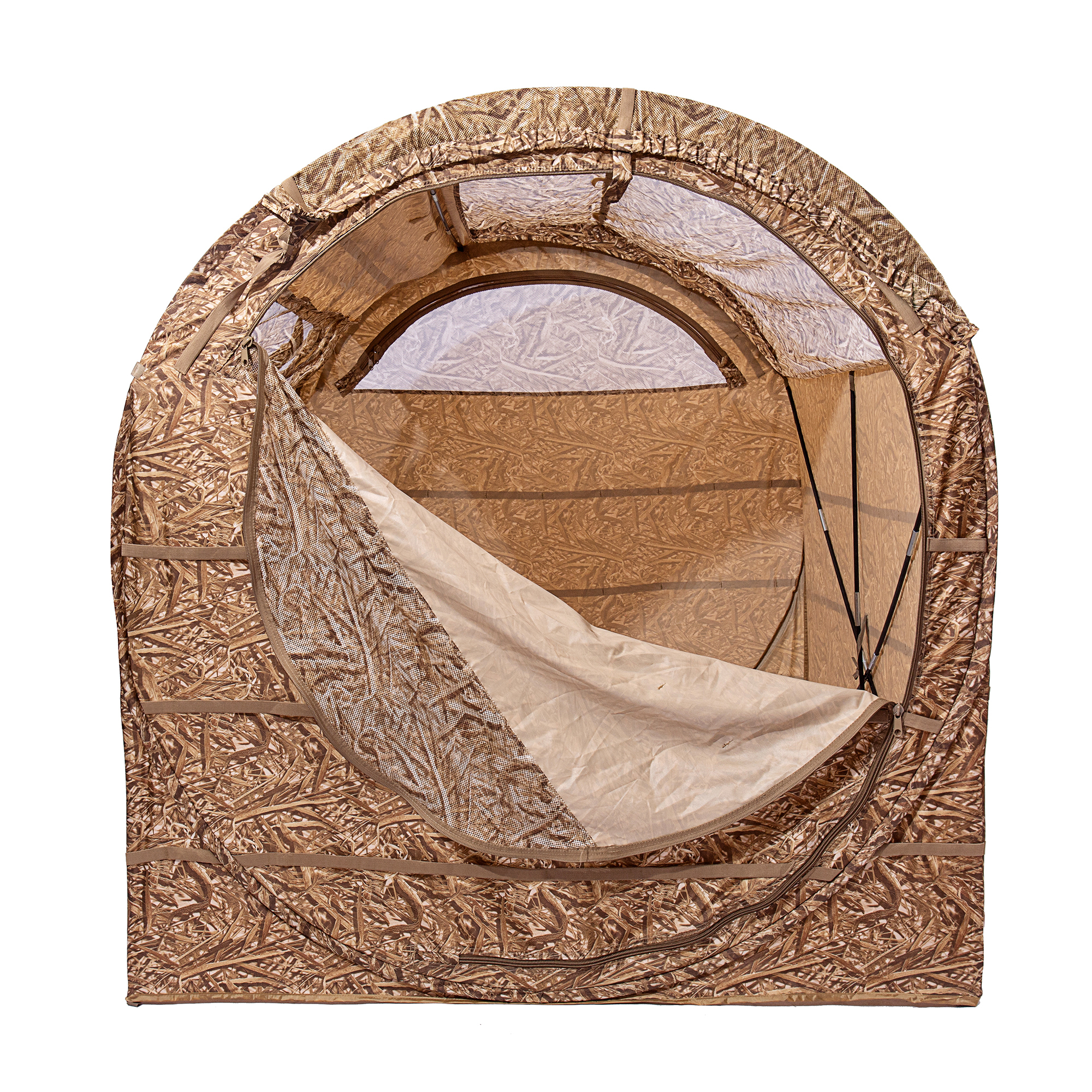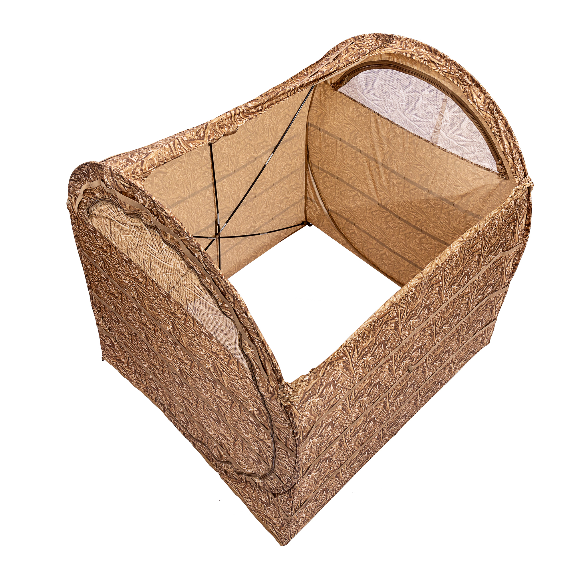 В засидке с комфортом размещаются два охотника в сидячем положении, не мешая друг другу. Внутри предусмотрены карманы для мелочей и лямки для крепления маскировочного материала, чтобы адаптировать внешний вид под окружающую растительность.