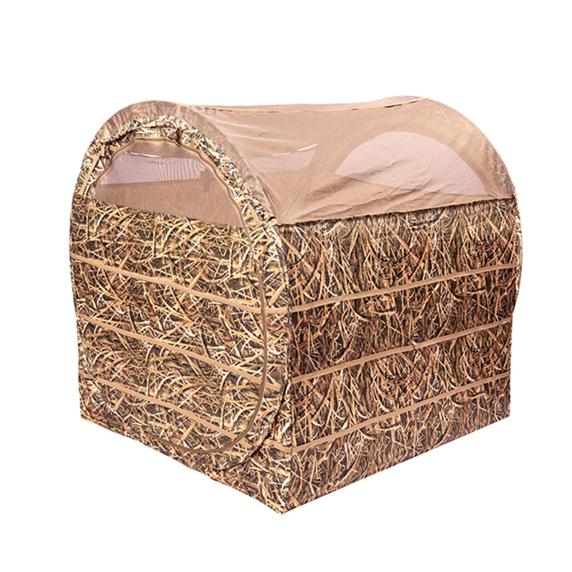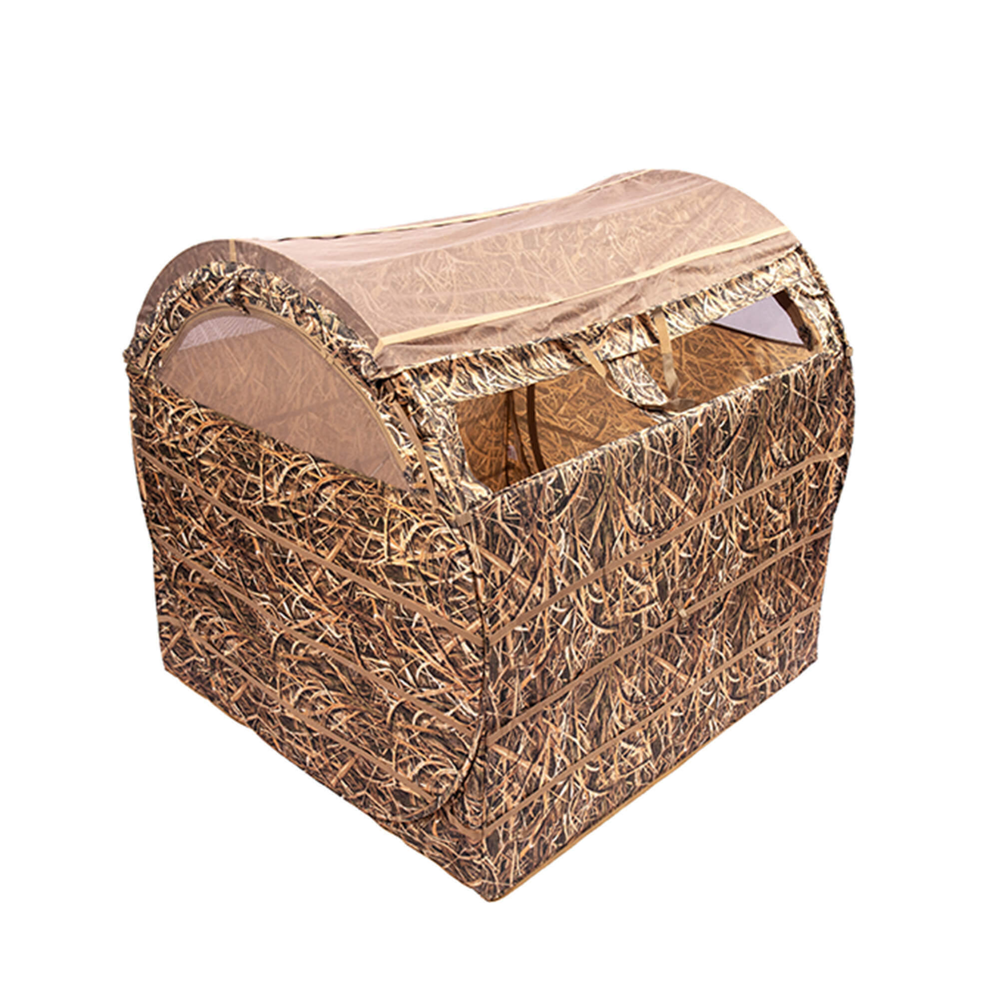 В засидке с комфортом размещаются два охотника в сидячем положении, не мешая друг другу. Внутри предусмотрены карманы для мелочей и лямки для крепления маскировочного материала, чтобы адаптировать внешний вид под окружающую растительность.