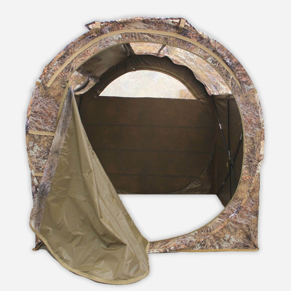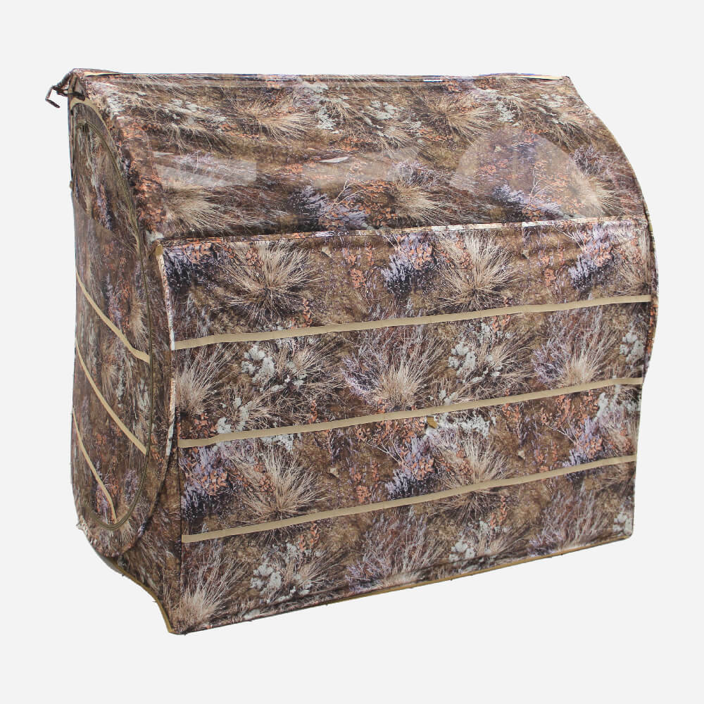 В засидке с комфортом размещаются два охотника в сидячем положении, не мешая друг другу. Внутри предусмотрены карманы для мелочей и лямки для крепления маскировочного материала, чтобы адаптировать внешний вид под окружающую растительность.
